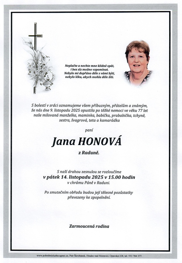 11.00 hodin Smuteční síň Raduň - Ludmila Majnušová, 86 let