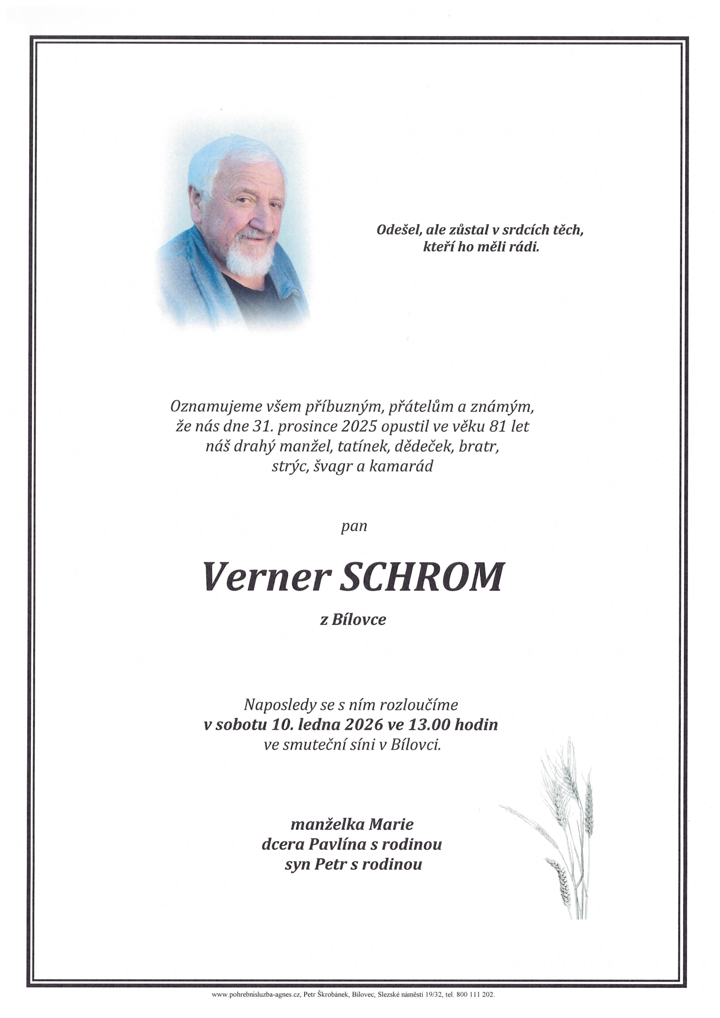 13.00 hodin Smuteční síň Bílovec - Verner Schrom, 81 let