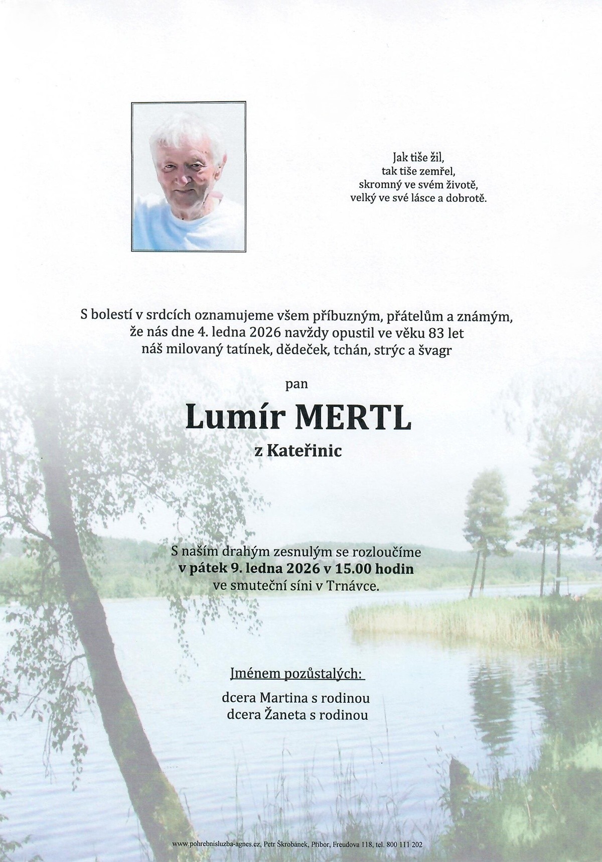 15.00 hodin Smuteční síň Trnávka - Lumír Mertl, 83 let