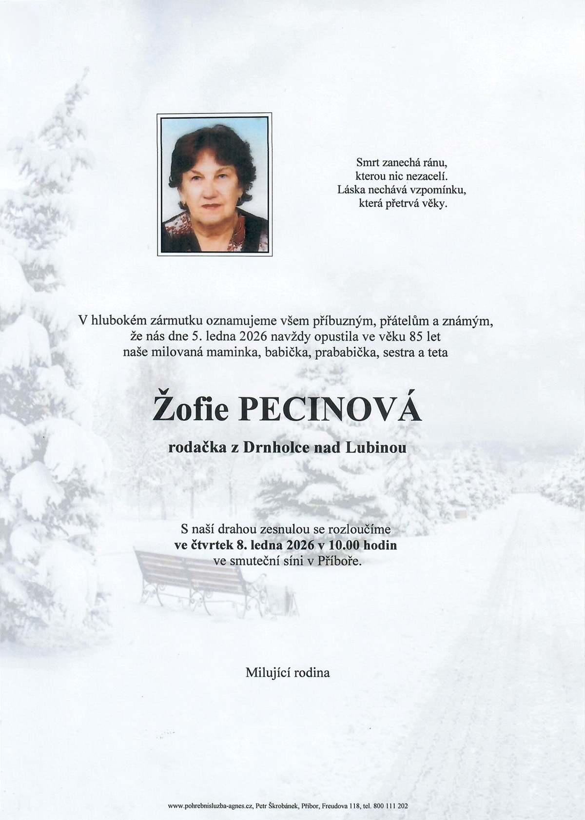 10.00 hodin Smuteční síň Příbor - Žofie Pecinová, 85 let