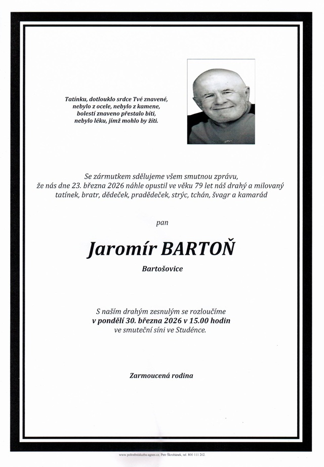 15.00 hodin Smuteční síň Studénka - Jaromír Bartoň, 79 let