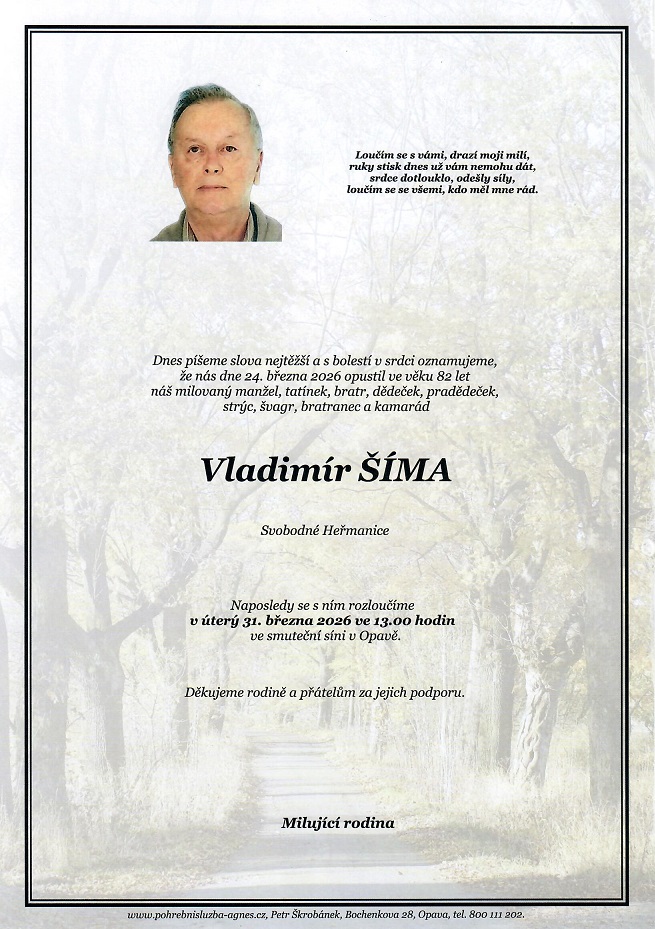 13.00 hodin Smuteční síň Opava - Vladimír Šíma, 82 let
