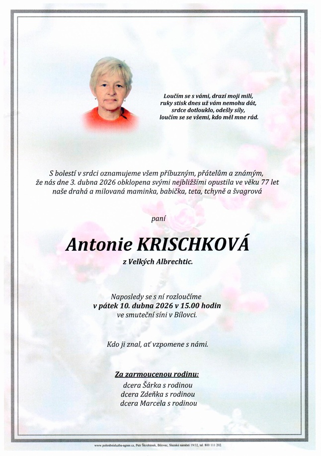15.00 hodin Smuteční síň Bílovec - Antonie Krischková, 77 let
