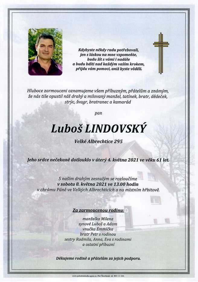 Přehled pohřbů a rozloučení obsahuje pouze ty obřady, u kterých objednavatel vyjádřil souhlas s uveřejněním.