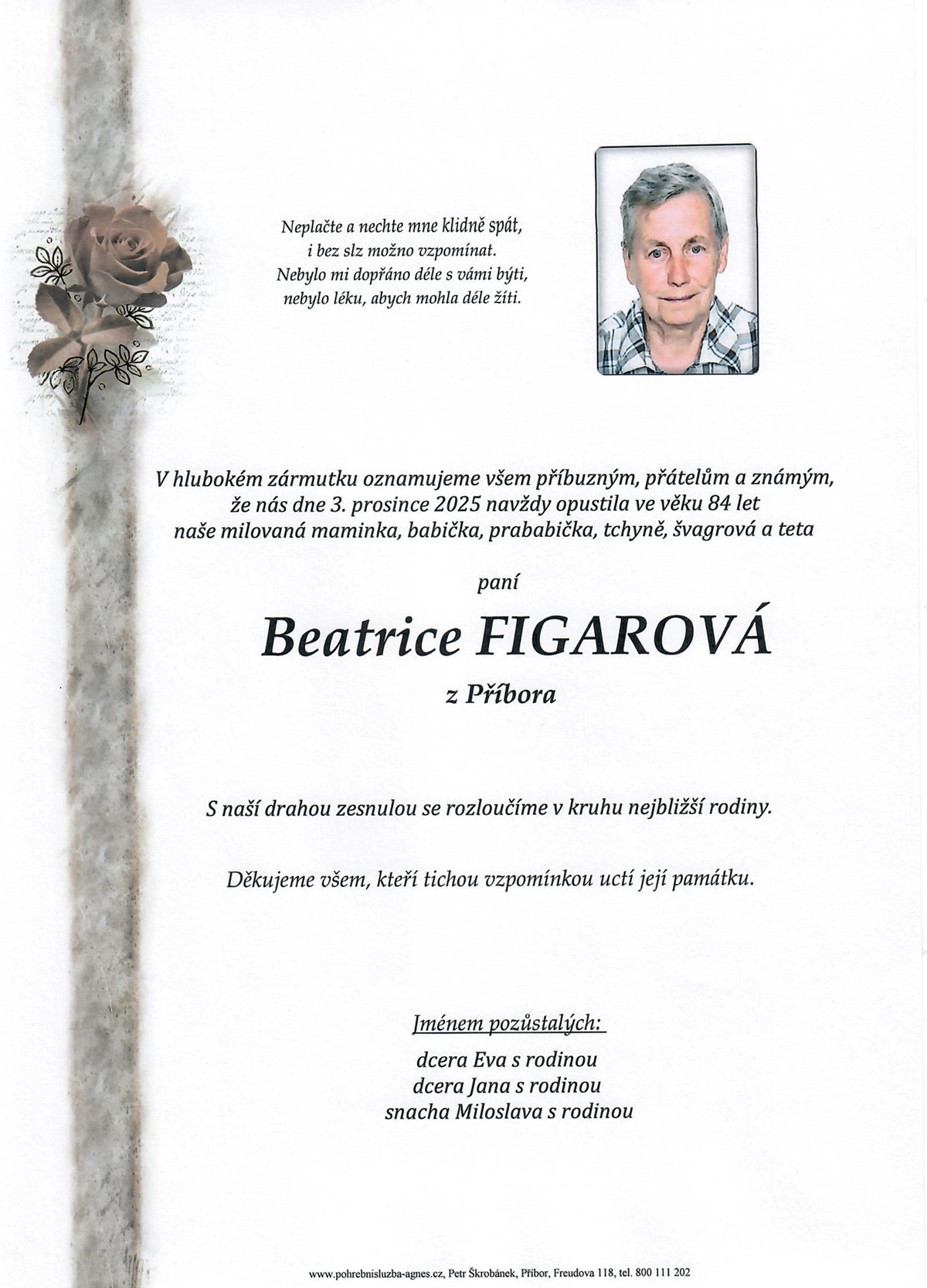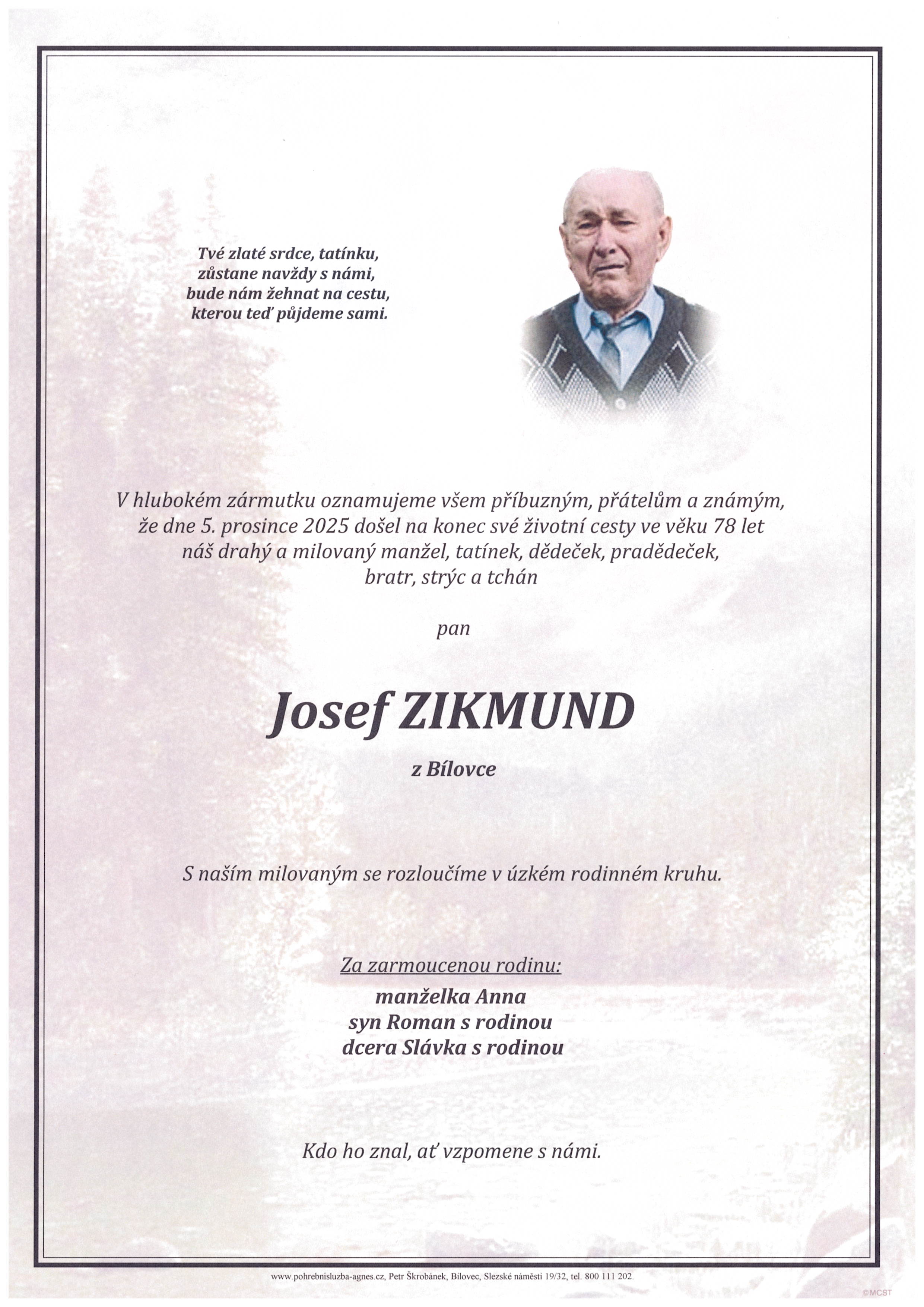POHŘEBNÍ SLUŽBA PETR ŠKROBÁNEKSlezské náměstí 19/32, 743 01 Bílovec (sídlo firmy, fakturační adresa) IČ: 12655422, DIČ: CZ6605021203 č.ú.: 4011490349/0800 telefon: +420 556 410 810 e-mail: psagnes@seznam.cz ![]() | BEZPLATNÁ LINKA: +420 800 111 202NONSTOP LINKA: +420 603 519 090 |
