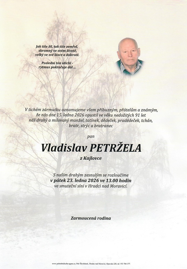 13.00 hodin Smuteční síň Hradec nad Moravicí - Vladislav Petržela, 90 let