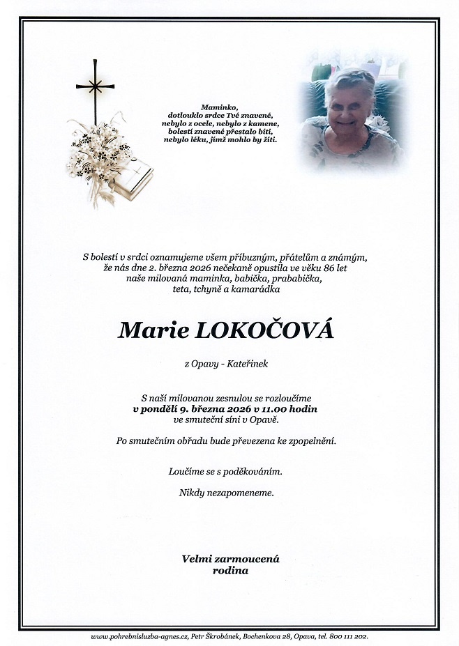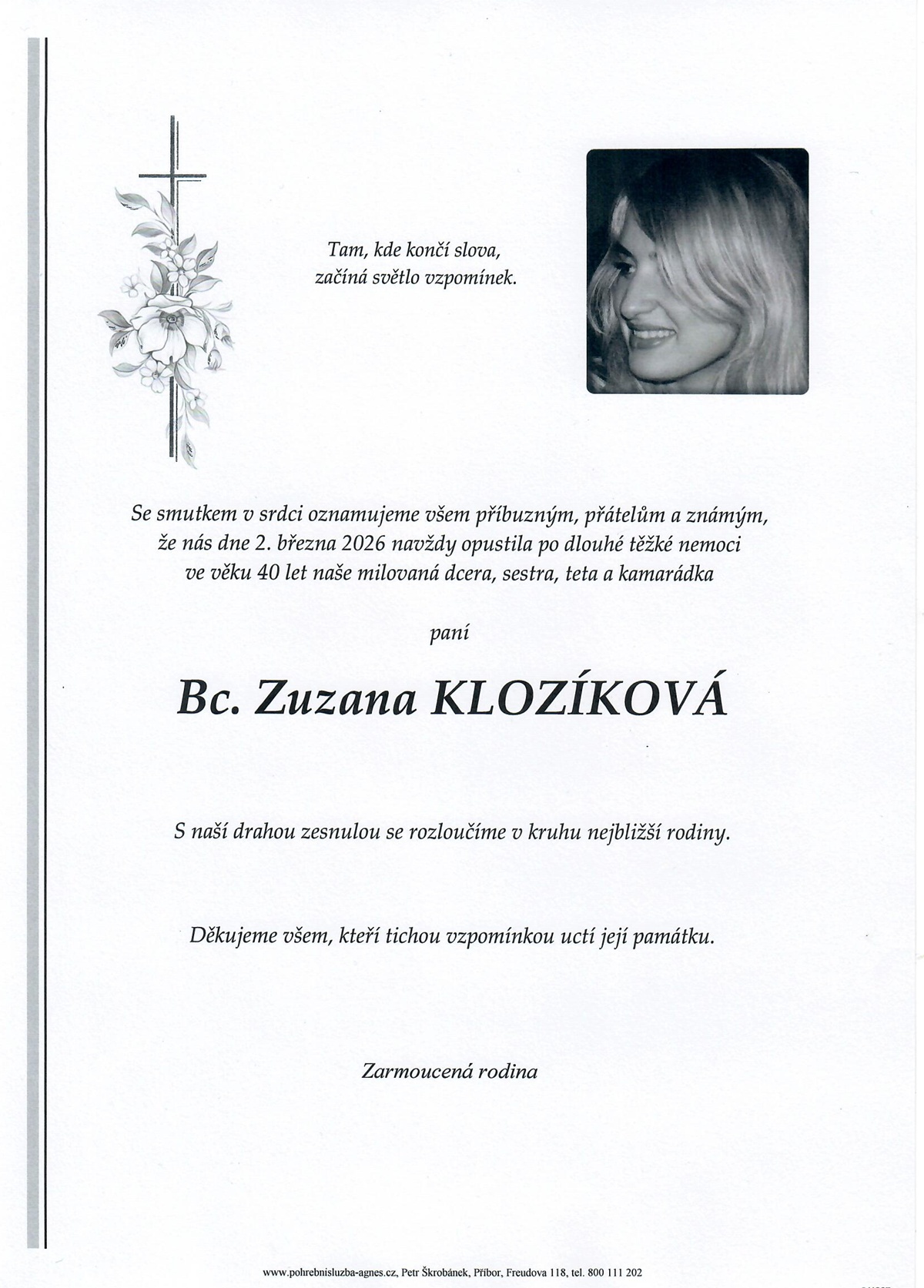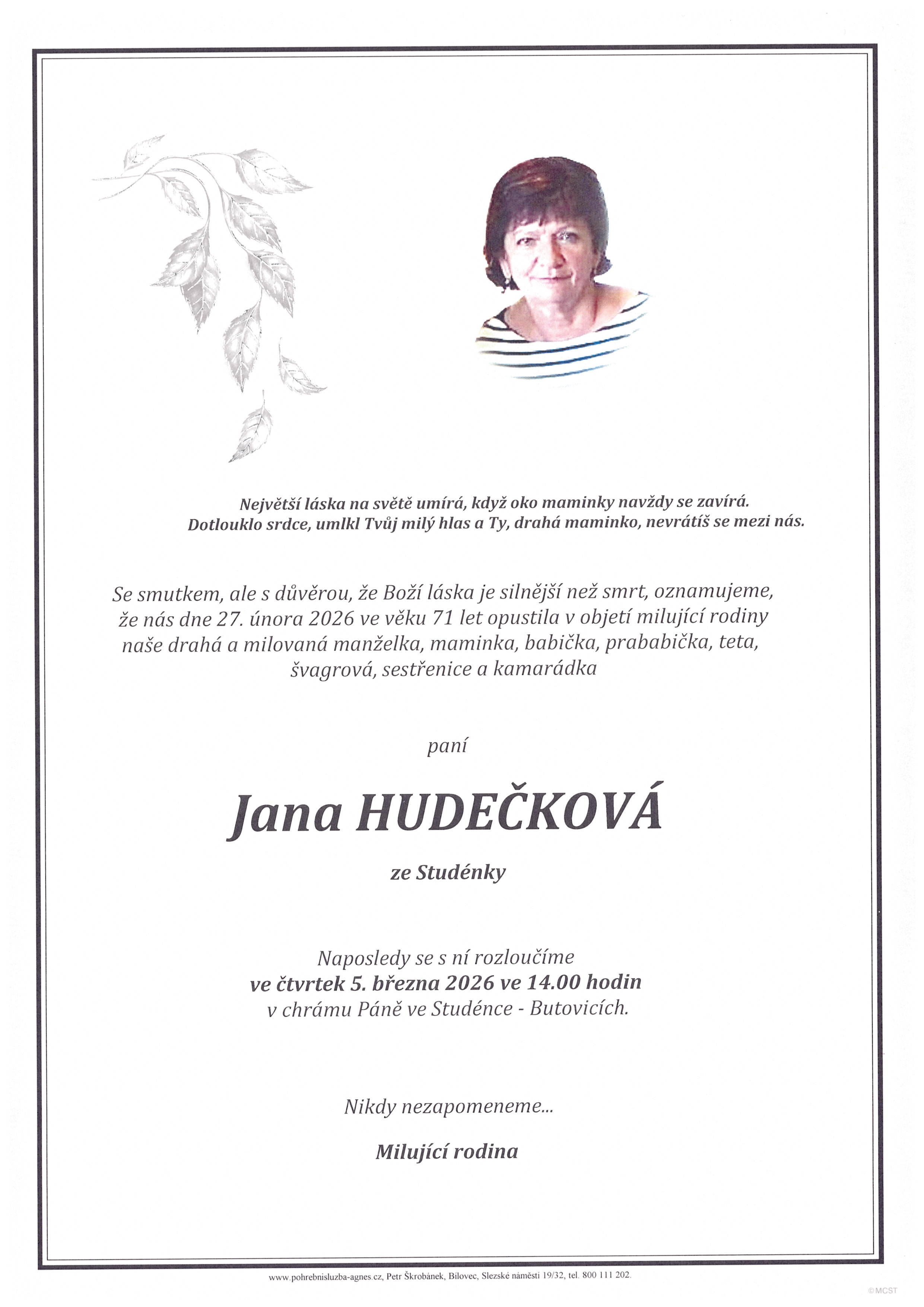 Aktuální rozloučení - pohřby | Pohřební služba St. Agnes, Bílovec, Opava, Hradec nad Moravicí, Studénka, Příbor, Fulnek